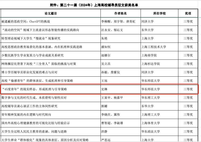 在市教卫工作党委、市教委举办的第二十一届(2024年)上海高校辅导员论坛征文活动中,我院辅导员史琳的论文《“45度青年”的现实样态、形成机理与引导策略》荣获三等奖。