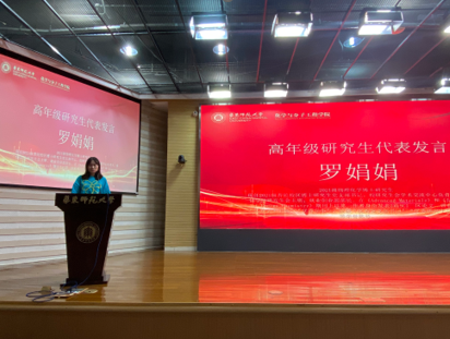 高年级研究生代表罗娟娟祝贺同学们即将开启一段全新而充实的求学之旅。回顾四年硕博时光,她将自己的三点感悟分享给大家。第一,明确目标,规划好自己的人生道路,在不断追求中实现自己的人生价值。第二,保持对学习科研生活的热爱,在学术之余感受丰富多彩的校园生活,培养良好的兴趣爱好。第三,心存感激,服务社会,在学有余力的同时积极参加学生工作。最后,罗同学祝大家生活美好、学业有成。
