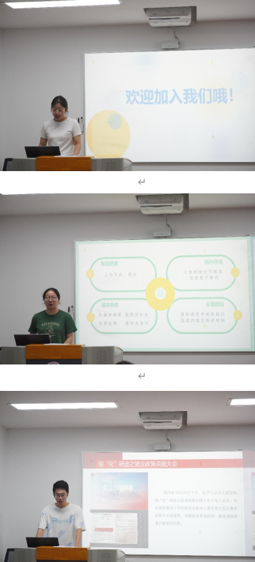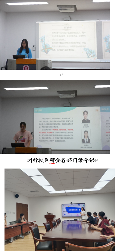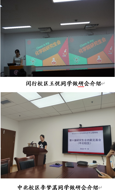 化学与分子工程学院第十届研究生会招新大会分别于9月18日19:00和9月19日18:30,在闵行校区化学楼135会议室、中北校区理科大楼B1602顺利开展。学院团委书记冯琪老师,两校区研会主席成员倪豪、王悦、李梦菡同学,两校区研会各部门骨干和有意向加入新一届的研会同学共同参与了本次会议。