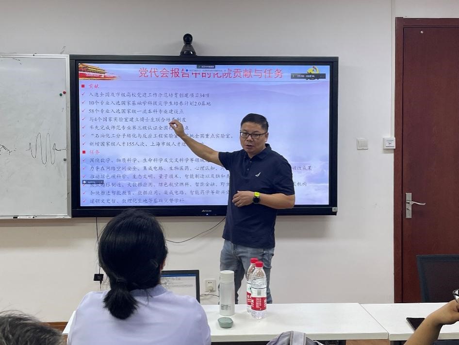 为了深入学习贯彻校第十四次党代会精神,2023年10月7日上午,化学与分子工程学院党委在闵行校区化学楼126教室召开党委理论学习中心组(扩大)学习会暨党支部书记例会,就学校第十四次党代会精神进行专题宣讲。学院党委委员、党支部书记、专职组织员和辅导员参加会议,院党委书记鲜跃仲主持会议。