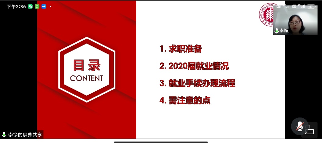 在讲座后半部分,李铮老师以2020届毕业生数据为例,向同学们介绍了我校毕业生就业情况,并有针对性地介绍了化学院2020届硕士、博士的毕业去向。李老师还为同学们梳理了毕业生就业派遣流程,以及签订三方协议、办理户口迁移等方面的注意事项。