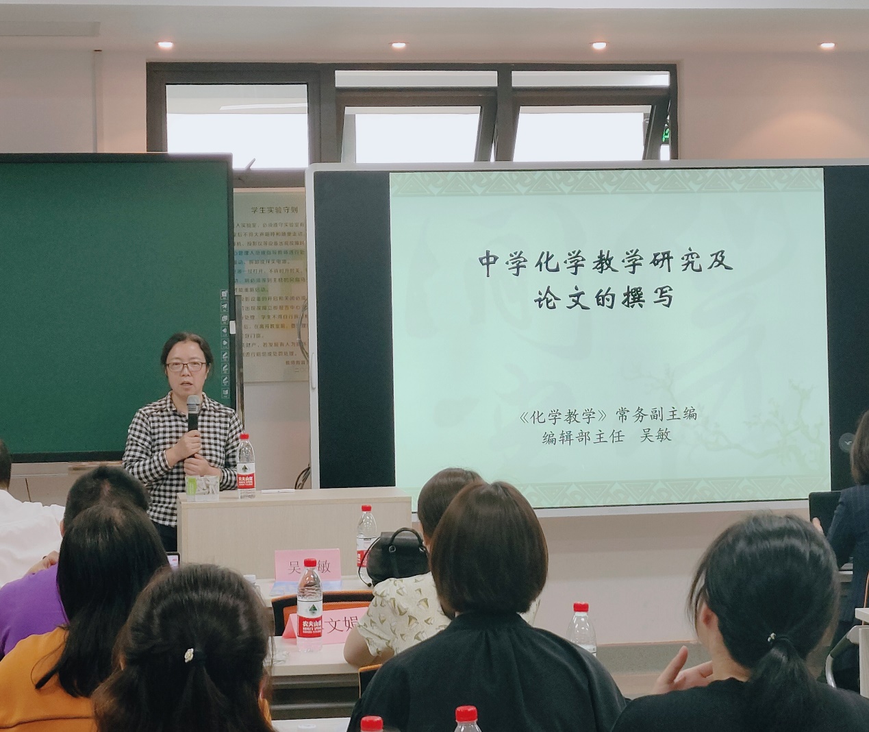 在专家讲座板块,学院邀请了多位教师为学员进行学术报告。徐林教授的报告《超限制造流动化学》介绍了通过超限制造将传统的化工工厂转化为一个超现实的微型化、绿色化化工工厂;张利东教授的《水凝胶柔性传感器助力脑机接口发展》报告中理论与实例相结合阐述了如何通过探究影响水凝胶柔性传感因素,创新突破人工AI壁垒技术;王欢教授的《碳中和与绿色碳科学》报告介绍了“绿色碳科学”内涵,凸显从纯粹理论知识到工厂实际生产的跨越式发展;陈启明教授《慧眼看世界》的报告从量子思维视角带领学员们重新认识化学学科的特征和思维的特点,感受到化学学科核心知识的独特魅力;王清江教授作《中学化学课外探究选题及案例分析》报告中指出中学生课外探究课题选题的一般原则,结合具体实例介绍课题选题和书写报告中应注意的相关问题;《化学教学》执行主编吴敏编审从期刊论文编审的视角,分析目前中学化学教师在论文写作上存在的主要问题,深入浅出阐述论文撰写的关键要素,搭建出一座促进一线教师由学习型转变成研究型教师的“桥梁”。讲座内容用前沿知识抛砖引玉,内涵丰富深刻,学员们收获满满。