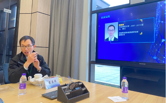 参观结束后,一行人前往会议室参加座谈会。座谈会第一环节,由华东师范大学2014届博士毕业生、研发化学服务部助理主任翟昌伟进行交流。翟博回忆了自己在师大校园读书、科研和运动的点滴,介绍了自己从入职到现在在药明康德的成长与进步。
