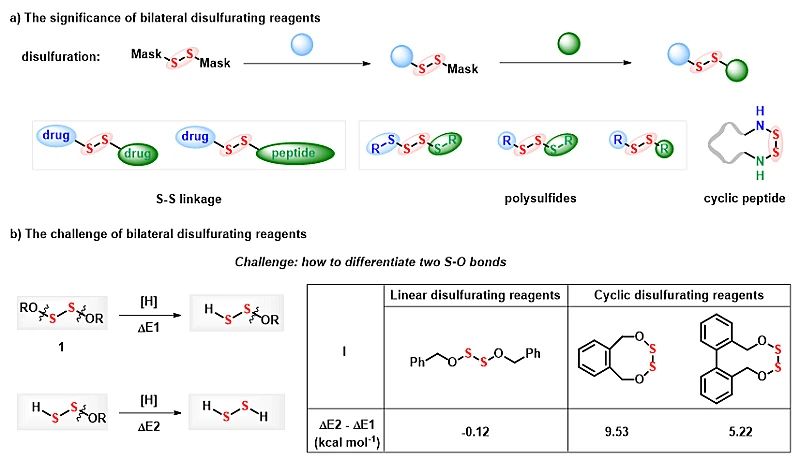 尽管如此,如何在二硫单元两侧自由而便捷地安装所期望的模块,以获得多样性功能的多硫化合物依然是一个难题。近日,该课题组再次以“面具效应(mask effect)”为策略,通过对刚性联苯中环嵌入二硫单元获得稳定双边二硫试剂,基于中环张力的开闭环能量差,实现二硫两侧模块化和可控化安装(图2a)。通过分子力学方法(MM2)的计算进一步预测:刚性联苯中环二硫结构分子,两个S-O键在开闭环结构下能量差可达9.53 kcal mol-1(八元环)和5.22 kcal mol-1(十元环),可有效地选择性区分两个硫氧键,实现了模块化和可控化安装(图2b)。