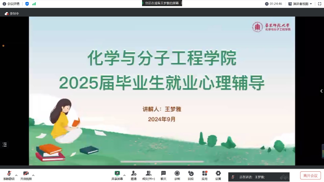 9月18日晚19:00,化学与分子工程学院线上举办了2025届毕业生就业动员会,为学院2025届近500位毕业生提供最新的就业指导和求职技巧培训。本次会议特别邀请学院特邀党建组织员王毅老师出席,学院党委副书记王婷婷老师、研究生毕业班辅导员王梦雅老师参加会议。会议由院团委书记、研究生毕业班辅导员冯琪老师主持。