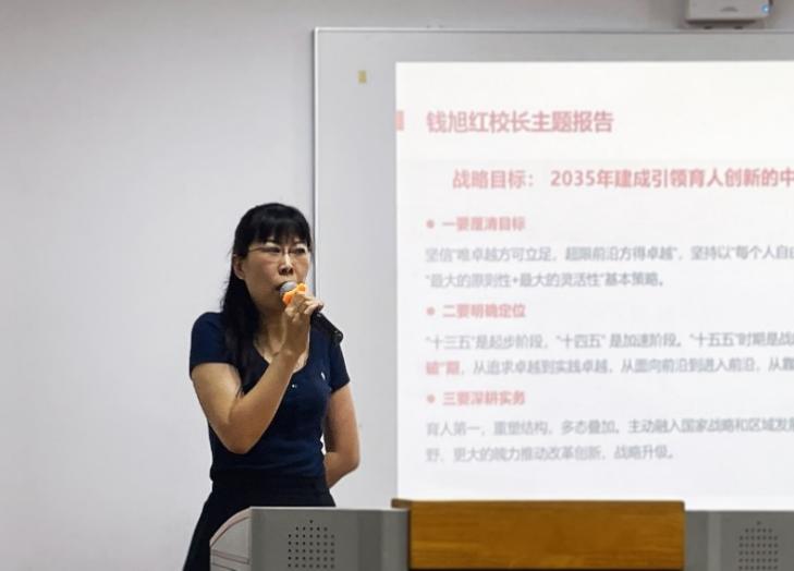 王媛媛书记以《打好“十四五”收官战,谋划“十五五”新篇章》为题,传达暑期校党委全委扩大会议精神,对新学期工作提出新要求、寄予新期望。
