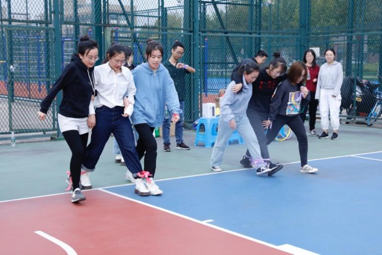 在“袋鼠跳”项目中,师生采用迎面接力形式,双脚套在袋子中跳跃前进,按完成时间进行排名,其中紫队一马当先,拔得头筹。