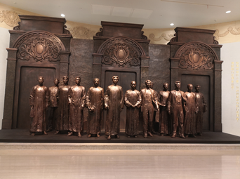 纪念馆包含序厅,13名中共一大代表的群体铜像站立正中央,代表着中华民族复兴的“伟大的开端”。