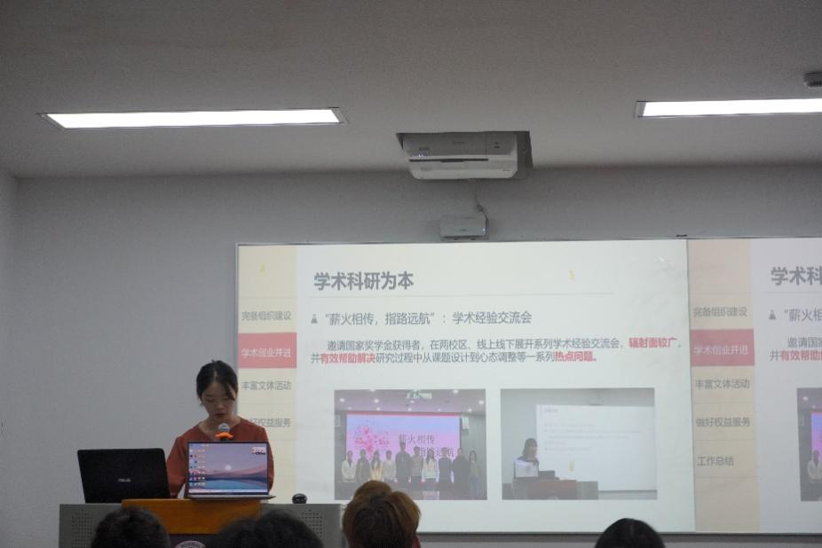 第九届研究生会执行主席邹鑫向老师及代表们做工作报告,总结并回顾了过去一年的工作情况。她首先感谢了学院党委和校团委的领导、学院团委的指导,介绍了第九届研会完备的组织建设,在践行“三自职能”的基础上,举办各类技能培训,增强团队凝聚力;积极配合参与校会活动;注重与兄弟院系的交流合作,赢得了“红旗研究生会”的荣誉称号;旗下公众号的关注人数屡创新高。之后又从学术科研、文体活动、权益服务三个主要方面有针对性地介绍了化院的特色活动,展现了第九届研会对同学们实际需要的把握和跟进。