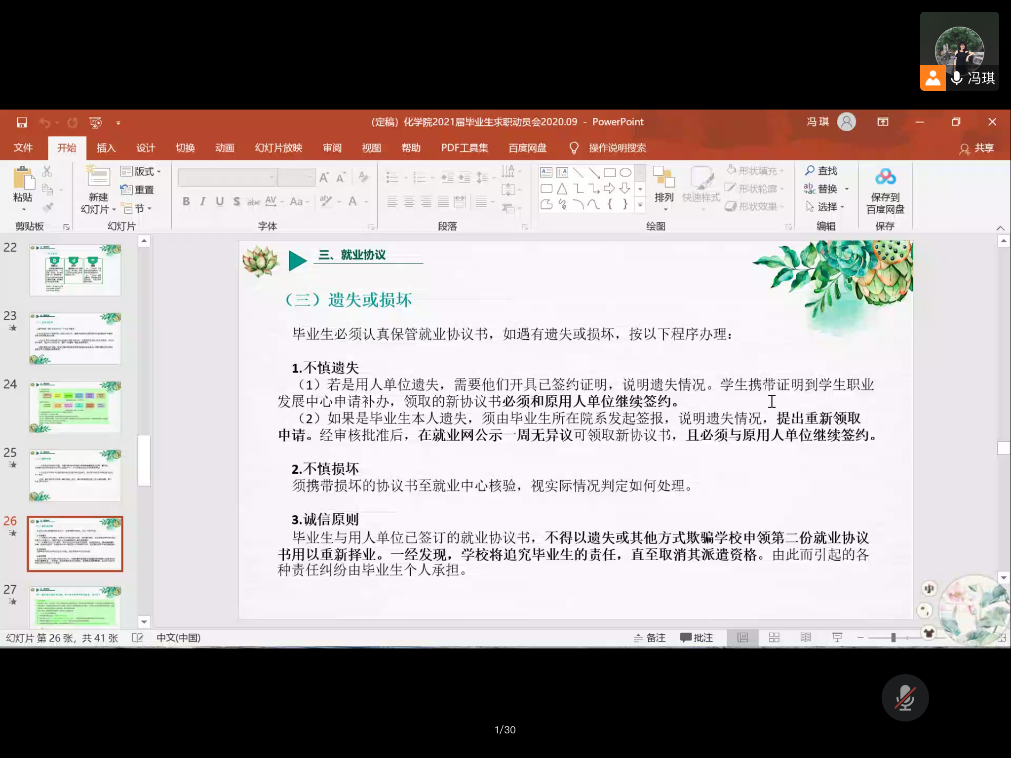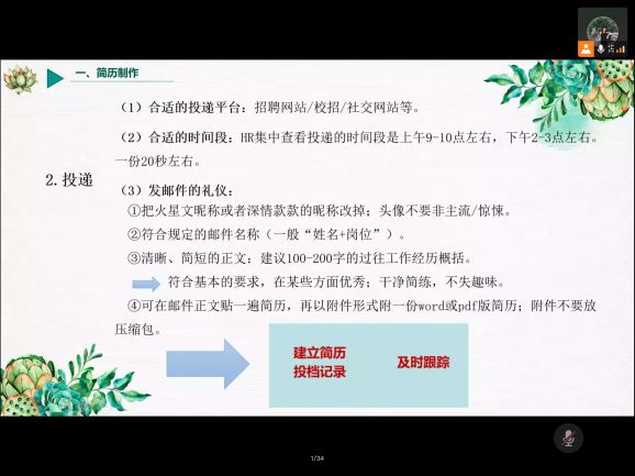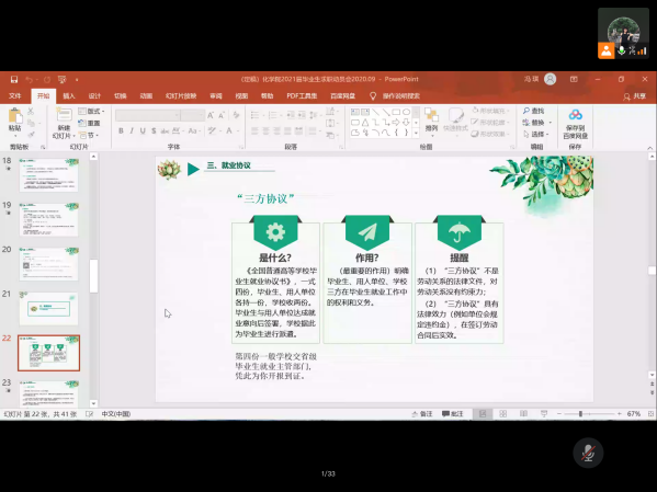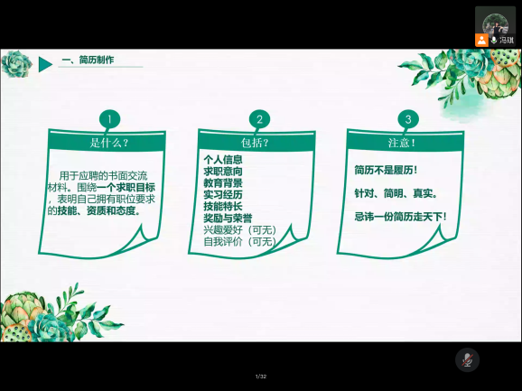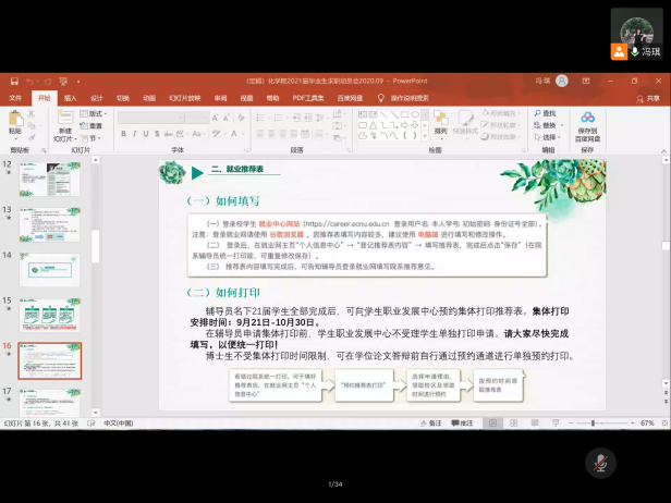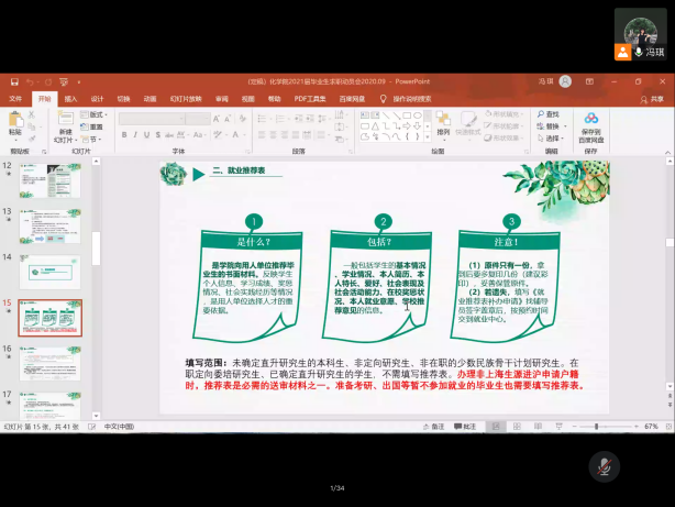会议开始后,中北2021届毕业班辅导员冯琪老师依次讲解了毕业生在求职、毕业派遣中会涉及到的简历制作,就业推荐表、就业协议填写,以及档案转递等四方面工作细节。