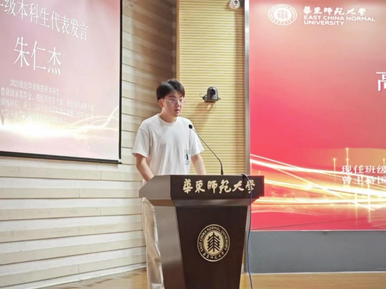 高年级本科生代表朱仁杰同学热烈祝贺和欢迎新同学们来到华东师范大学化学与分子工程学院这个大家庭。他鼓励同学们在打好专业基础之余,进入实验室积极探索,学到“真知识”、“真本领”;利用学校提供的各种资源多元发展,积极参加社会实践等,抓住机会提升自己。最后,他希望同学们课余可以去体验上海开放包容的城市文化。