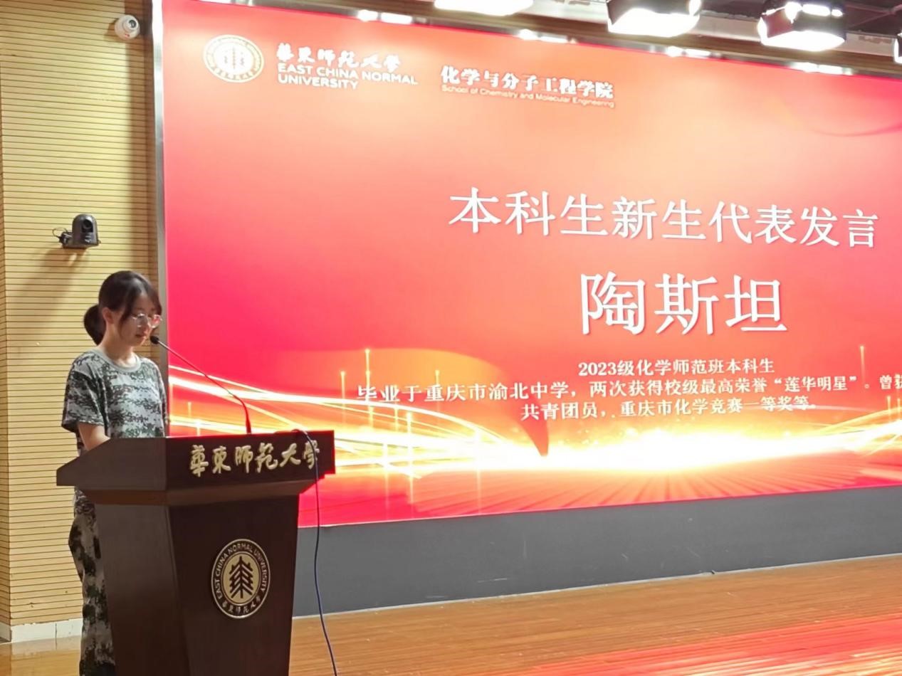 陶斯坦同学作为本科生新生代表发言,她的发言充分表达了进入华东师范大学学习的感激之情,对教育事业的憧憬之情,对化学学科学习的热情与期待。铭记初心、辛勤劳作、在苦乐中磨练自己,既是她对自己大学生活的要求,也是她对同学们的建议与劝勉。她积极号召同学们“收拾精神、并归一路”,集中精力钻研学问,创造出属于2023级新生们的更辉煌的画卷。