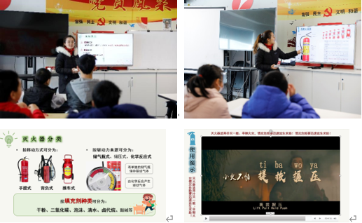 舒月老师随后带领同学们回顾了“燃烧”的定义、条件等课本上的知识,强调了灭火阻燃的核心要点,仔细讲解了灭火器的分类和差异。舒月老师着重介绍了干粉和二氧化碳两种灭火器的成分、原理、应用场景、注意事项等,并通过简短有趣的视频让同学们迅速掌握了灭火器的使用方法——“提(灭火器)”“拔(保险销)”“握(喷嘴)”“压(往下按压)”。