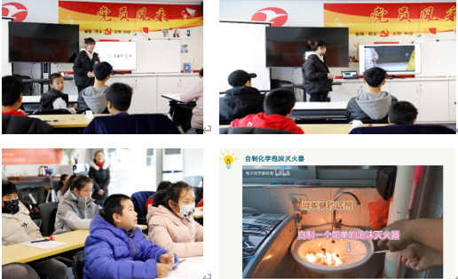 紧接着,来自“小化狮”实践团队的敬婷老师着重向大家介绍了泡沫灭火器、清水灭火器和卤代烷灭火器的原理和使用方法。同学们聆听了小敬老师对泡沫灭火器化学原理的讲解,也观看了自制泡沫灭火器的视频实验,大家产生了极大的兴趣。此外,小敬老师还为大家解释了卤代烷灭火器目前已全面停用的原因。课堂最后,在小敬老师的带领下,通过一问一答、自我梳理的方式对本次课程进行了复习强化,同学们出色地完成了老师们布置的随堂练习。