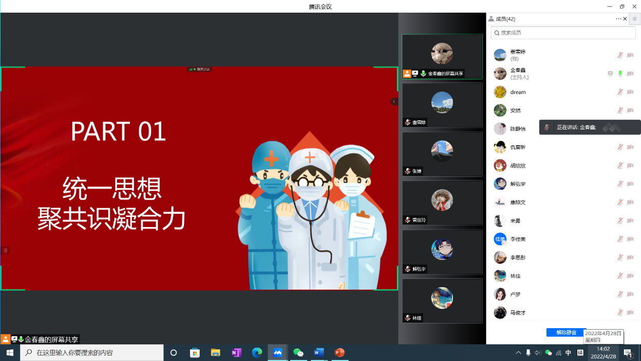 主持人金春鑫同志带领大家学习了习近平总书记关于疫情防控的重要指示精神,感受校园中抗击疫情的英勇时刻。