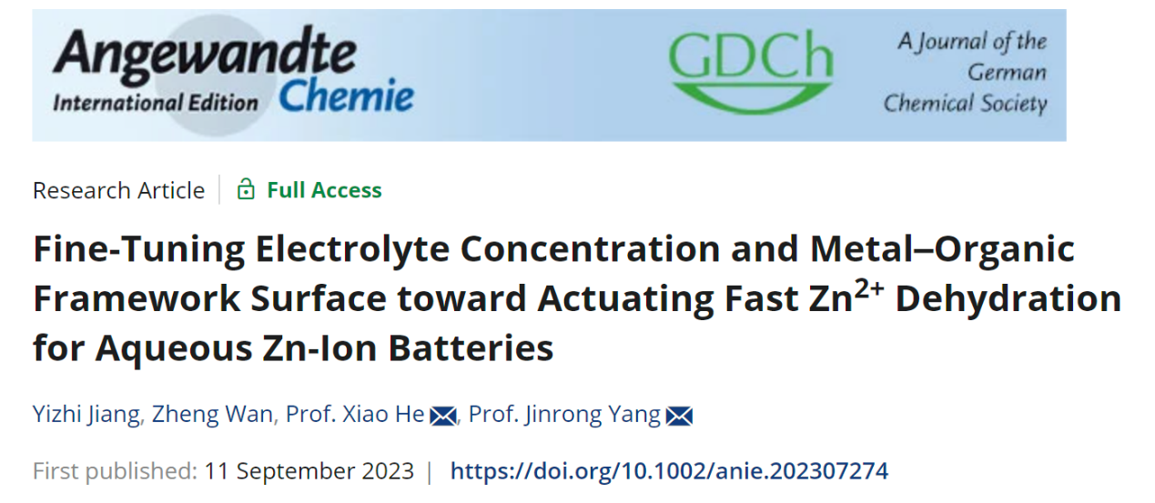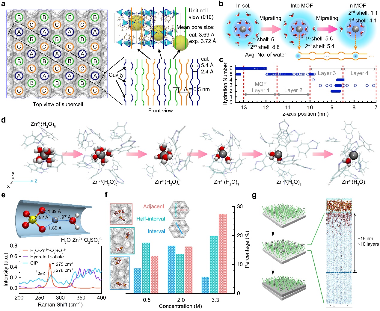 近日,华东师范大学化学与分子工程学院的何晓教授和杨金荣副研究员团队聚焦这一底层机制,以ZnSO4电解液和沸石咪唑酯骨架ZIF-7负极保护膜为概念验证,使用理论计算模拟系统探讨了其电解液结构,揭示了溶剂化水合锌离子通过膜层逐步脱水的机理,并据此提出了降低膜厚度至~16 nm和在ZIF-7表面修饰亲水基团来降低脱水,加速锌离子扩散的策略。相关工作在线发表在化学领域顶级期刊《德国应用化学》上(Angew. Chem. Int. Ed. 2023, e202307274),并被评为VIP文章(Very Important Paper)。