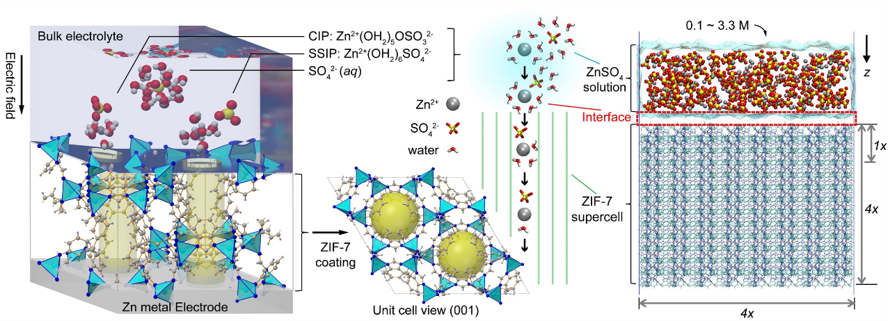 水系锌离子电池(AZIBs)使用水作为电解液溶剂,具有安全性高、成本低的优点,有望成为下一代储能解决方案。然而,负极上的锌枝晶生长、析氢反应等阻碍了其长寿命稳定循环。尽管负极保护膜金属有机框架(MOF)的引入能够提高循环寿命到数千小时、容量到200 ~ 300 mAh g-1,但距离理论上限820 mAh g-1仍有差距。为了进一步提升性能,对Zn2+离子迁移脱水及保护膜底层机制的理解必不可少,而相关系统研究鲜有报道。