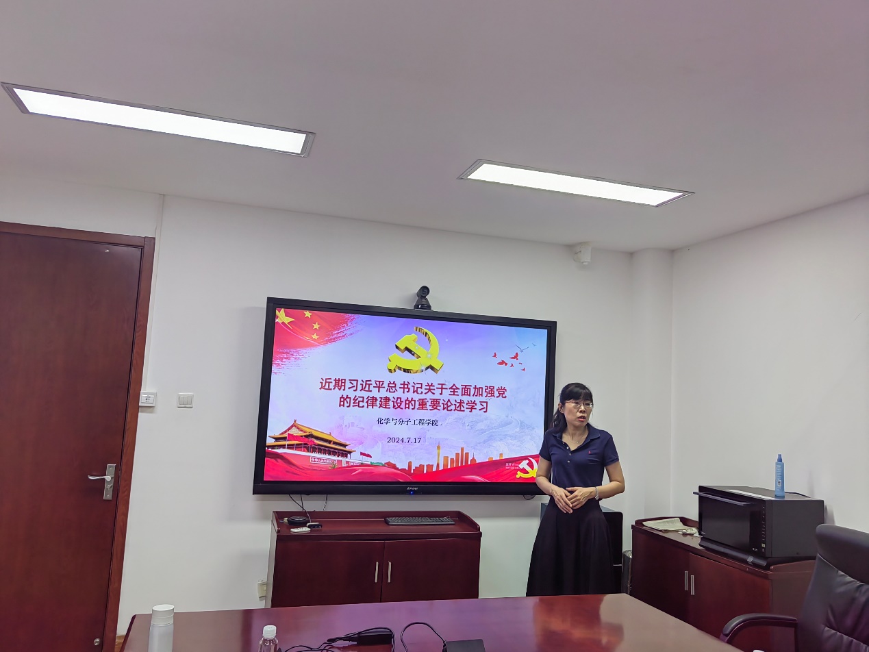 为更加全面地理解和执行党的纪律,推动党纪学习教育走深走实。2024年7月17日,化学与分子工程学院党委开展党纪学习教育集中学习研讨活动,认真学习领会习近平总书记关于全面加强党的纪律建设的重要论述,并就如何激活“三会一课”效能进行专题讨论。党委书记王媛媛主持学习研讨活动。