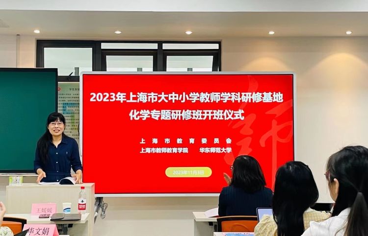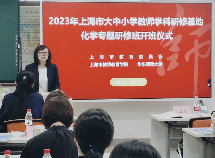 为贯彻落实全国教育大会精神,《中共中央国务院关于全面深化新时代教师队伍建设改革的意见》《中共上海市委上海市人民政府关于全面深化新时代教师队伍建设改革的实施意见》,进一步加强基础教育教师队伍建设, 将高校优质的学科和科研资源向基础教育教师辐射,促进基础教育教师的专业发展,上海市教师教育学院和华东师范大学合作共建上海市大中小学教师化学学科研修基地。2023年是二期共建的第二年,“中学化学教师专题研修班”于11月3日至5日在我校闵行校区开班。此次培训面向全市中学化学教师,40