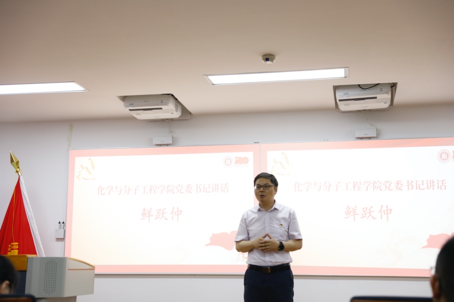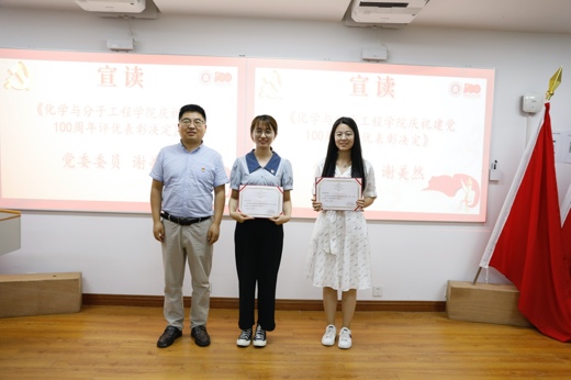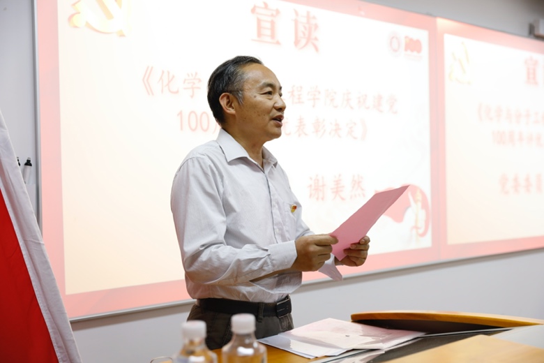 接着,党委委员谢美然宣读了《化学与分子工程学院庆祝建党100周年评优表彰决定》,并号召学院全体党员及党支部向受表彰的优秀党员和基层党组织学习。经过党员申请、支部评议和学院党委审议等程序,2名优秀党支部书记、11名优秀共产党员及1个先进基层党支部获得表彰。