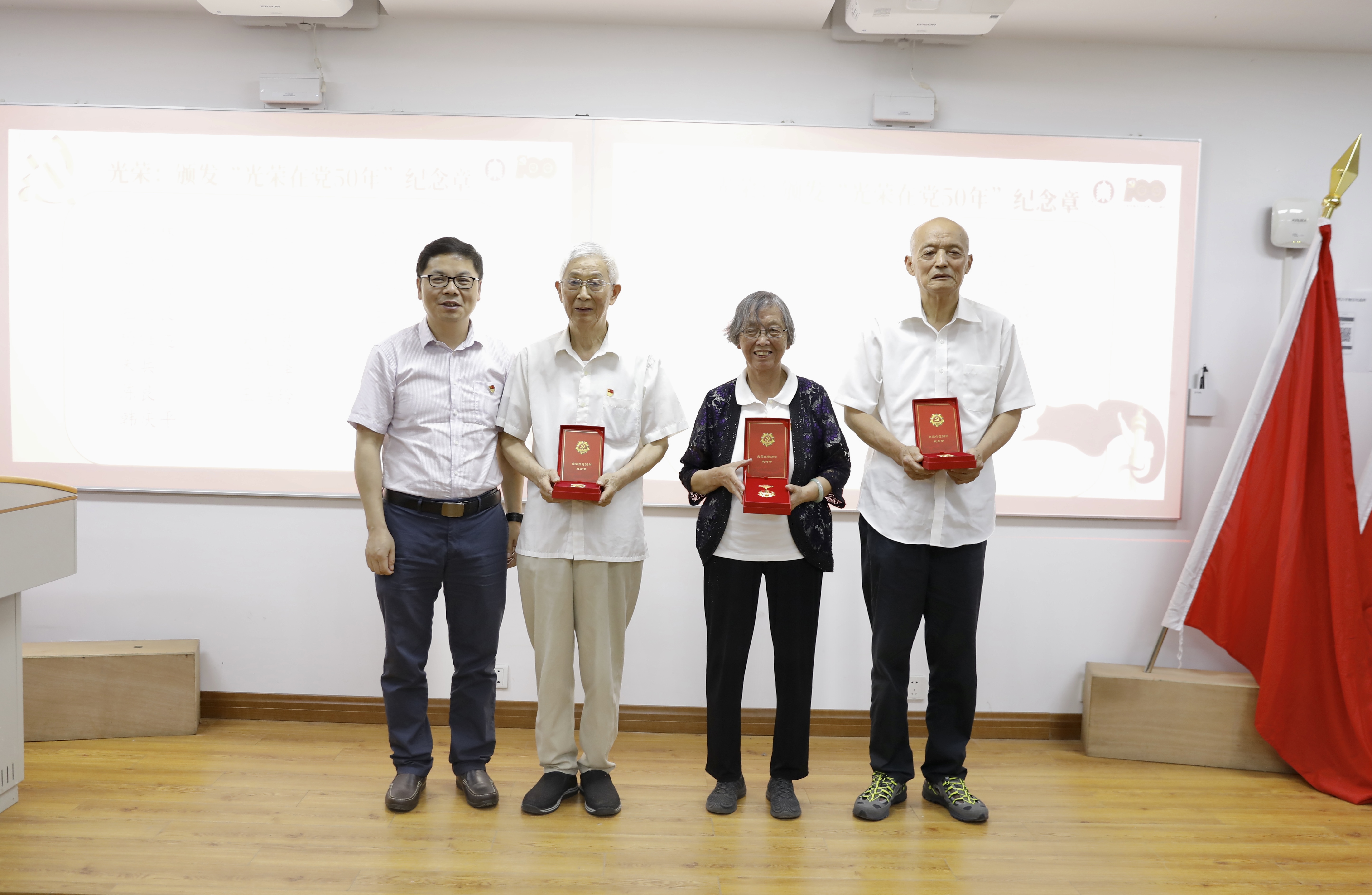 大会在嘹亮的国歌声中拉开帷幕。学院党委书记鲜跃仲为到场的三位退休教师党员代表颁发“光荣在党50年”纪念章,并向他们致以崇高的敬意。陈良、乐美卿和陶德祥三位退休教师党员分享了自己的入党经历以及几十年如一日在化学教育战线上的坚守,表达了对化学院的深厚感情。他们表示虽已退休,但仍要传承好党的光荣传统和优良作风,继续发光发热,为党和人民的事业添砖加瓦。