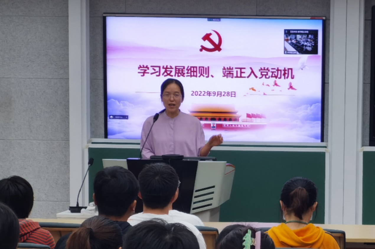 开班仪式结束后,培训班第一场讲座由化学与分子工程学院专职组织员曹美萍带来“学习发展细则,端正入党动机”报告。她为学员们详细介绍了发展党员工作的总要求、重要原则、流程及注意事项,强调发展党员工作必须严肃发展党员纪律,规范发展党员流程,让学员们明白每份思想汇报的重要性和必要性。最后,曹老师希望各位学员时刻以党员的高标准严格要求自己,努力做到“组织上入党,一生一世;思想上入党,一生一世”。