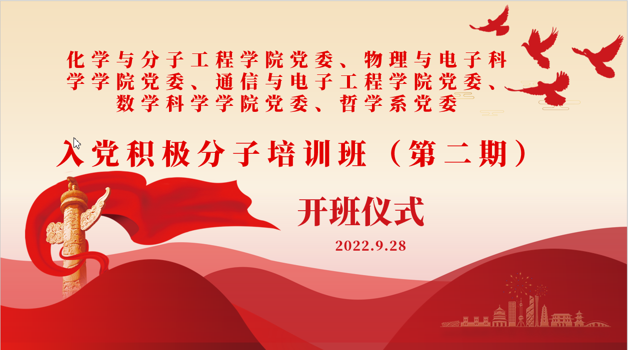 为进一步加强对入党积极分子的党性教育,提高其思想理论水平,9月28日下午,由化学与分子工程学院党委、物理与电子科学学院党委、通信与电子工程学院党委、数学科学学院党委、哲学系党委联合举办的入党积极分子培训班开班仪式成功举行。开班仪式主会场设在闵行数学楼102报告厅,各分会场通过视频连线参加。各学院共252名入党积极分子参加培训班,开班仪式由数学科学学院党委副书记余富团主持。