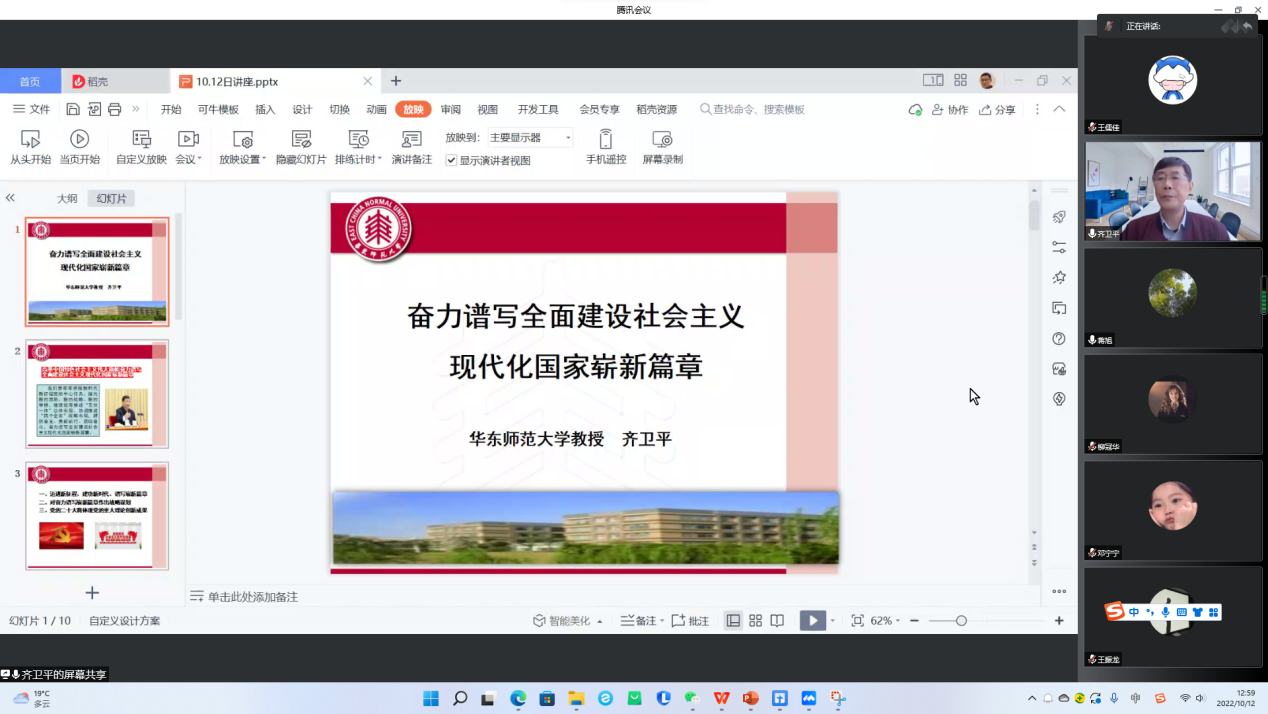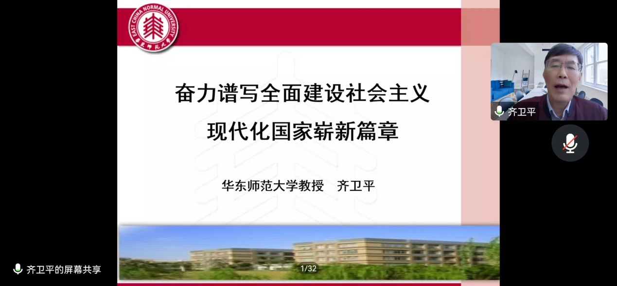 10月12日下午,化学与分子工程学院、物理与电子科学学院、通信与电子工程学院、数学科学学院、哲学系第二期学生联合党校第二课开讲。上海市中共党史学会副会长、上海市委讲师团党史学习教育专家宣讲团成员、我校终身教授齐卫平作主题报告,会议由物理与电子科学学院党委副书记蒋旭主持。