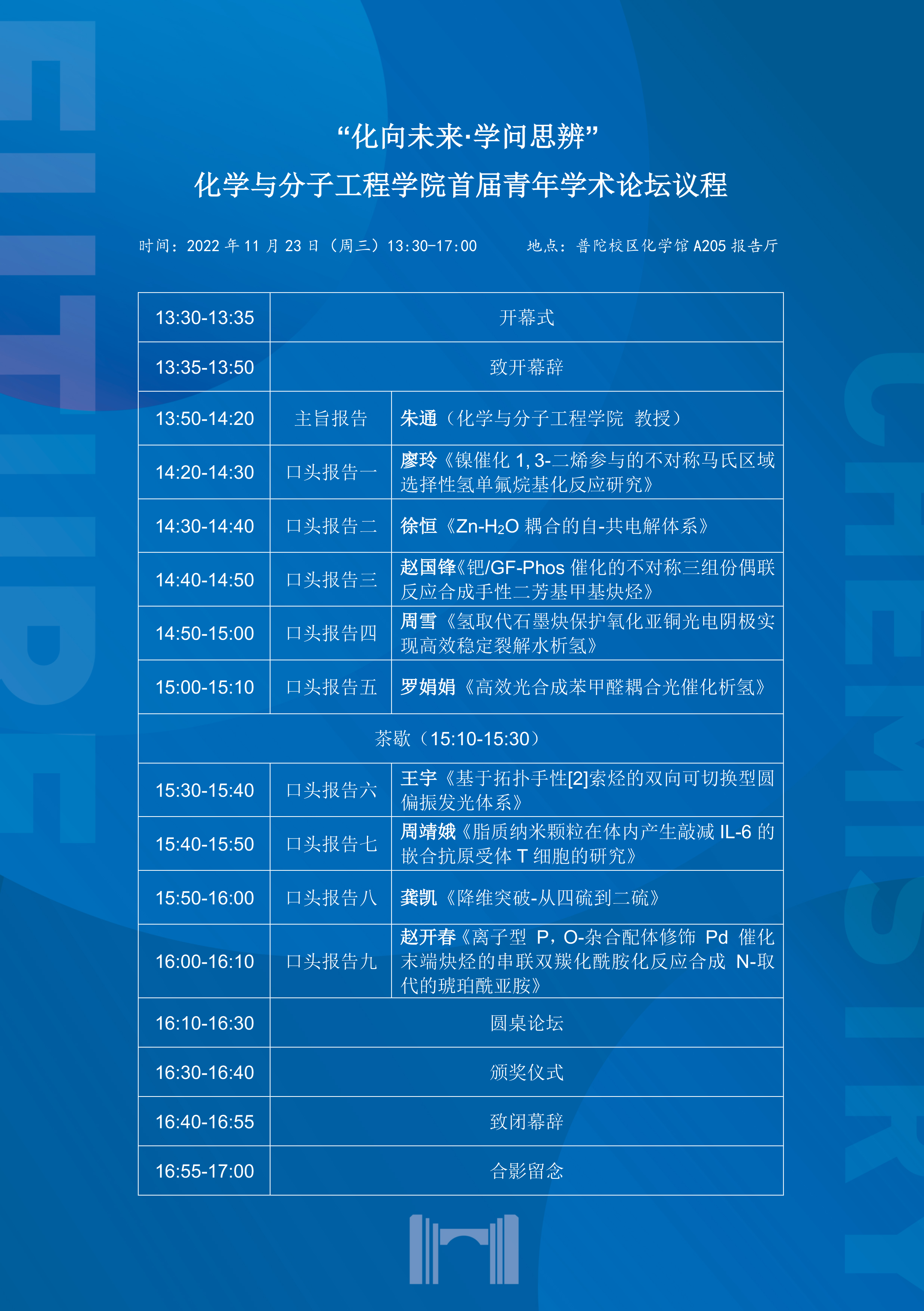 “化向未来·学问思辨”化学与分子工程学院首届青年学术论坛议程