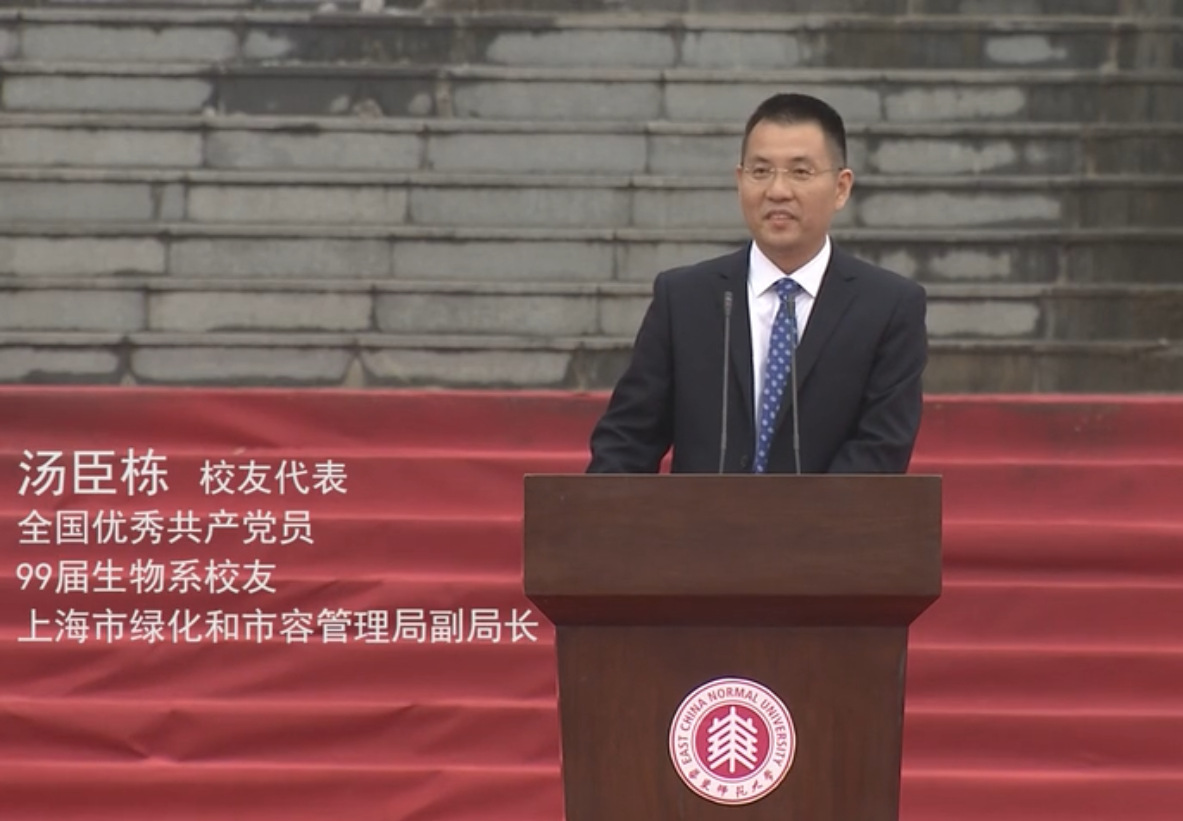 然后介绍了曾出席2017届毕业典礼的党员校友—汤臣栋。他是当代的护鸟人,用赤诚之心兢兢业业地守护着崇明东滩自然保护区,坚持着保护环境的理想,脚踏实地,忠于职守;