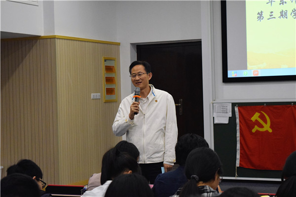 随后谭靖雯同志向大家介绍了华师大校史上的三位党员校友:袁振国、汤臣栋、董卿,详细讲述了他们的人生历程以及给我们的人生启迪。他们都曾经是我校的学生,同时也是党员,怀着坚定的理想和信念给予我们人生的感悟。