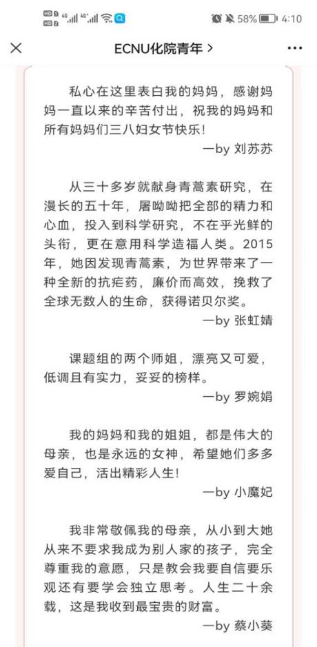 3月7日,化学与分子工程学院两校区研会筹备开展了“你和三月,都是春天”的女生节征集活动,其内容分为:1、女同学们的今昔对比照以及祝福;2、讲述自己的女性偶像,以记录女同学们成长过程中那碰触内心的感动、那潜移默化的蜕变和意想不到的惊喜,活动参与对象为我院的全体学生。我们带着深切的祝福将每一个美好的祝愿与期盼送到女孩子们的手中。