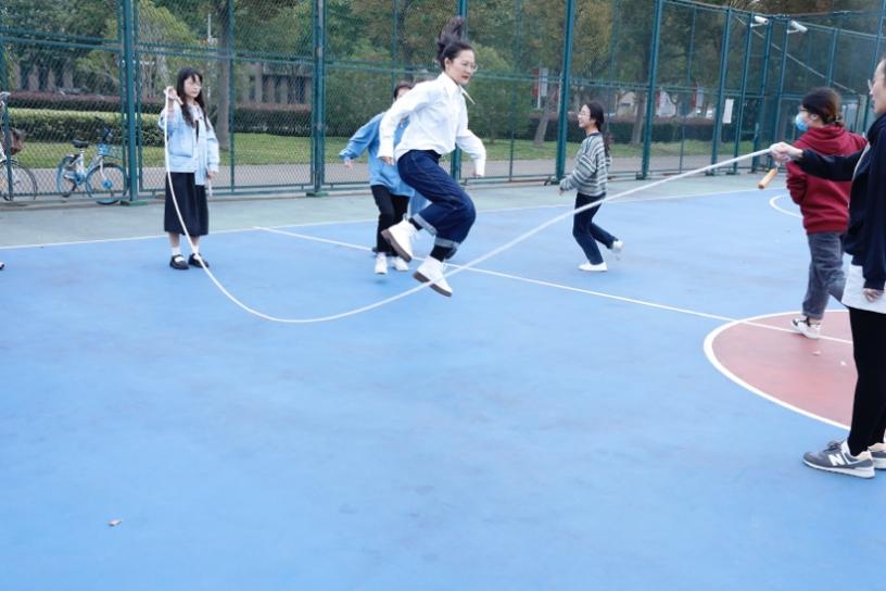 在“袋鼠跳”项目中,师生采用迎面接力形式,双脚套在袋子中跳跃前进,按完成时间进行排名,其中紫队一马当先,拔得头筹。