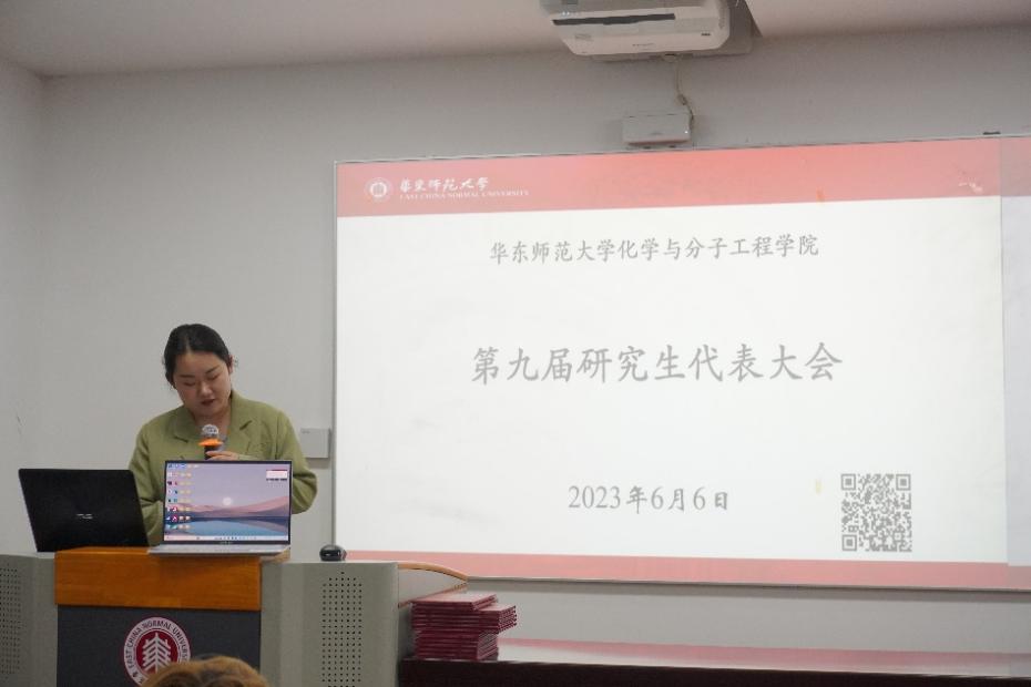 第九届研究生会执行主席邹鑫向老师及代表们做工作报告,总结并回顾了过去一年的工作情况。她首先感谢了学院党委和校团委的领导、学院团委的指导,介绍了第九届研会完备的组织建设,在践行“三自职能”的基础上,举办各类技能培训,增强团队凝聚力;积极配合参与校会活动;注重与兄弟院系的交流合作,赢得了“红旗研究生会”的荣誉称号;旗下公众号的关注人数屡创新高。之后又从学术科研、文体活动、权益服务三个主要方面有针对性地介绍了化院的特色活动,展现了第九届研会对同学们实际需要的把握和跟进。